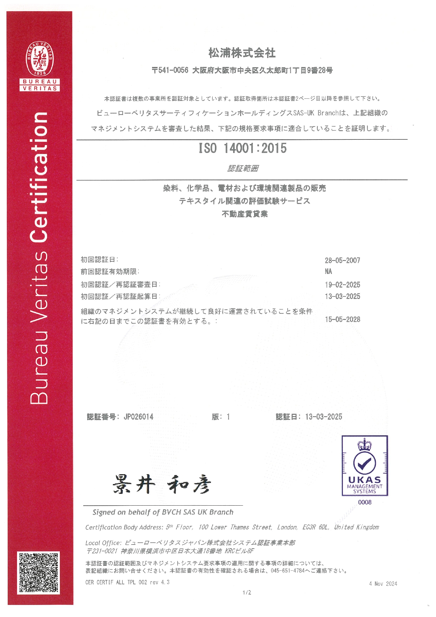 当社は2007年5月28日にISO14001の認証を取得いたしました。